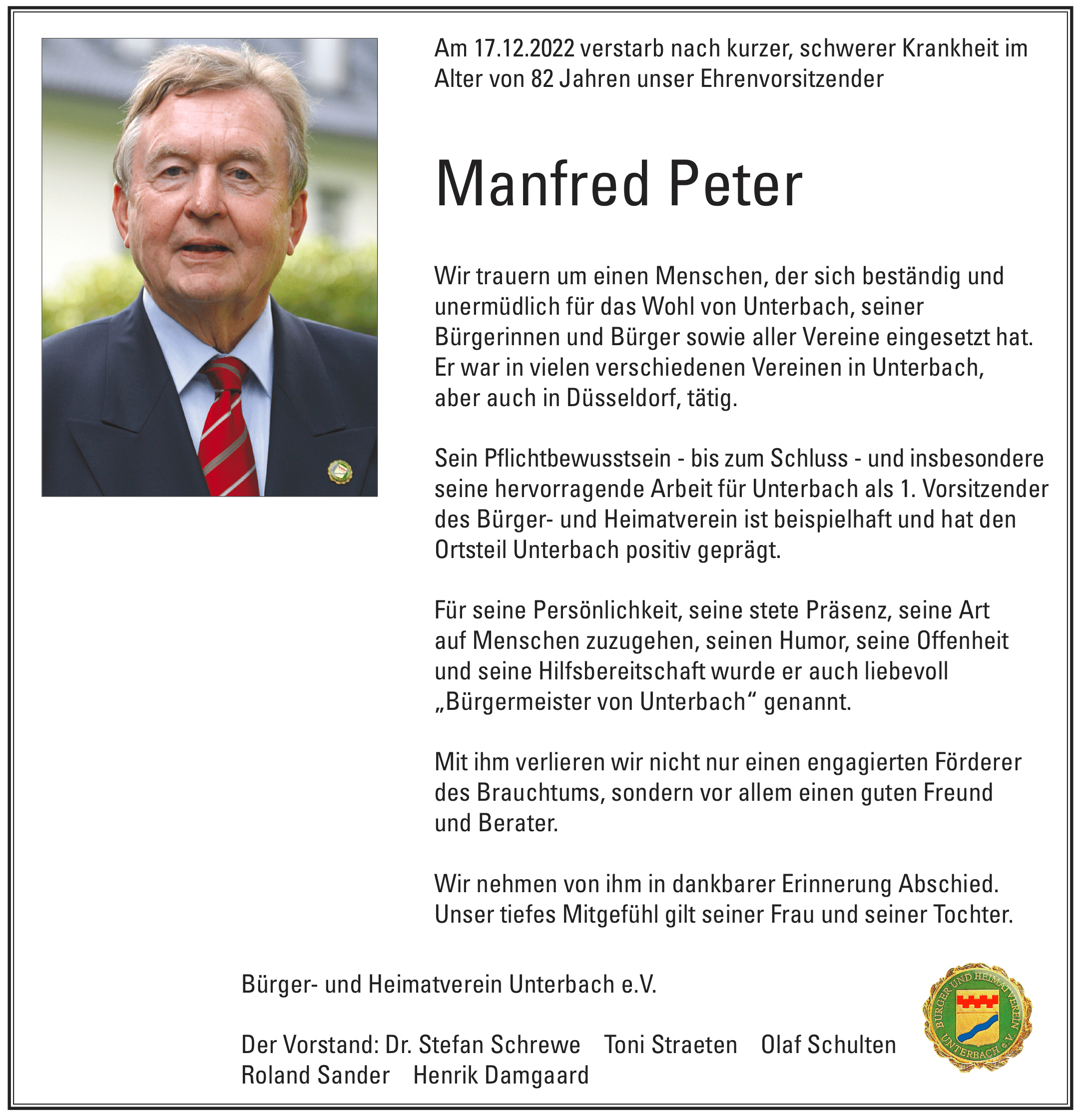 Der Ehrenvorsitzende des Bürger- und Heimatvereins Unterbach, Manfred Peter, ist nach kurzer, schwerer Krankheit gestorben. Liebevoll wurde er „Bürgermeister von Unterbach“ genannt...